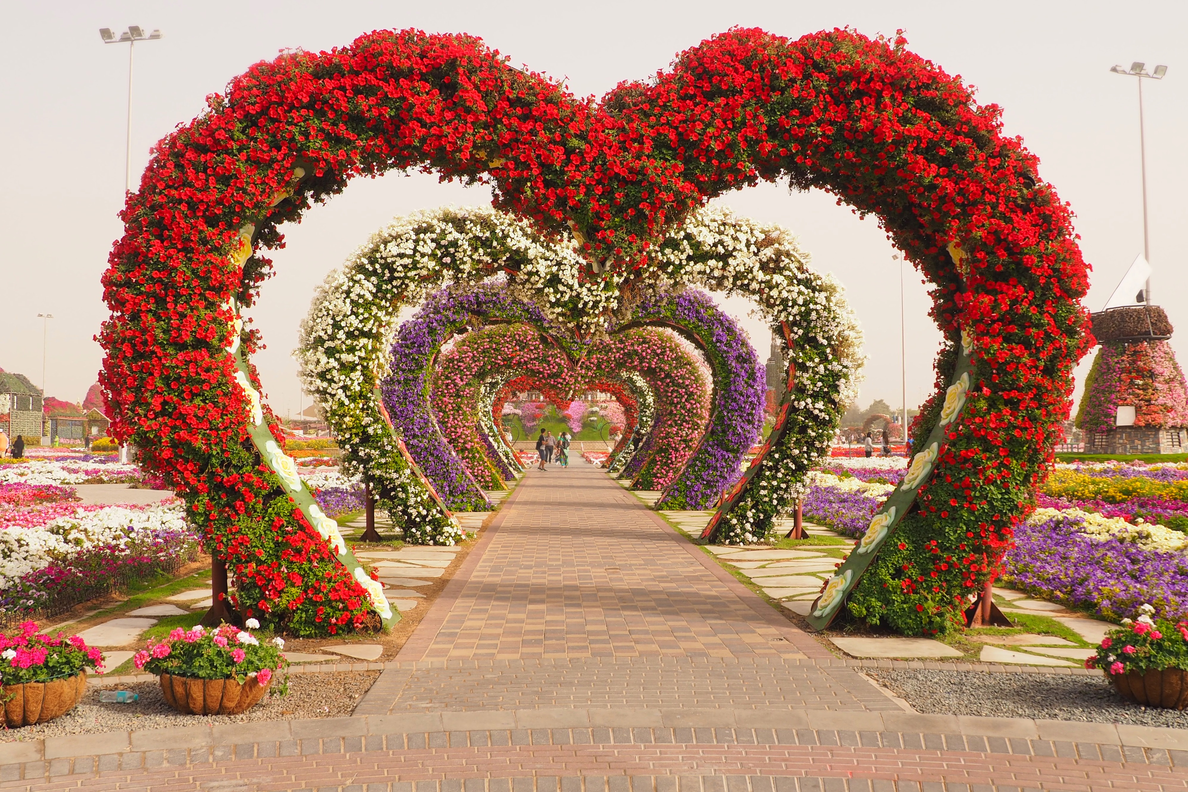 Each bend of the path offers something more wild and creative. 45 different species of flowers coat large structures shaped as peacocks and windmills, they billow off faux homes lining a path that mimics the streets in a neighborhood of houses and create a mesmerizing field of patterns. There is literally something incredible to gawk at in every direction you look.